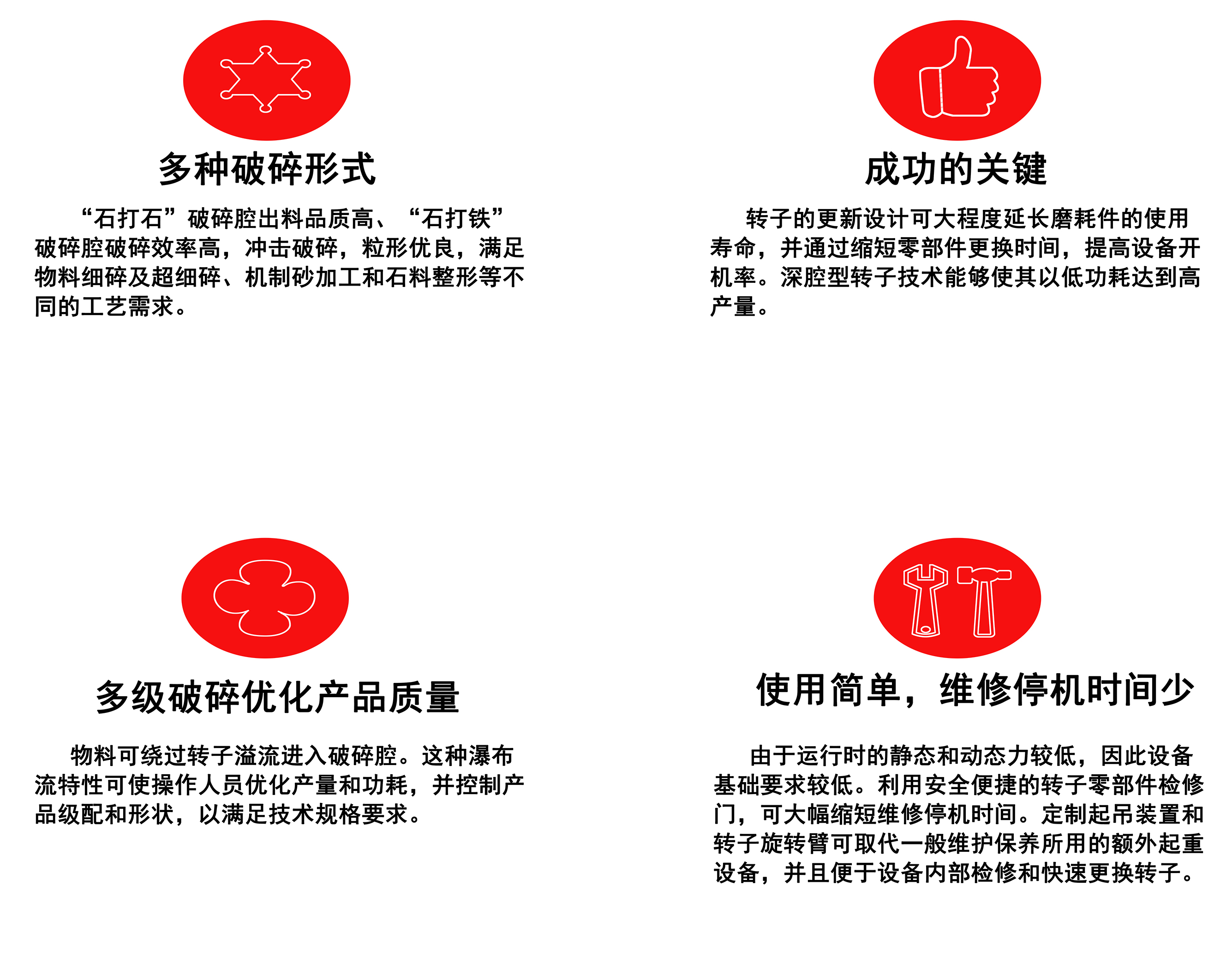 原料從機(jī)器上部直接落入高速旋轉(zhuǎn)的轉(zhuǎn)盤,在高速離心力的作用下,與轉(zhuǎn)盤周圍分流的另一部分靶石以傘狀高速碰撞,進(jìn)行高密度粉碎。石塊相互碰撞后,轉(zhuǎn)盤與殼體之間會(huì)形成漩渦運(yùn)動(dòng),產(chǎn)生反復(fù)的相互打擊、摩擦、滾動(dòng),然后從下部排出,多次形成閉路循環(huán),所需粒度由篩分設(shè)備控制。